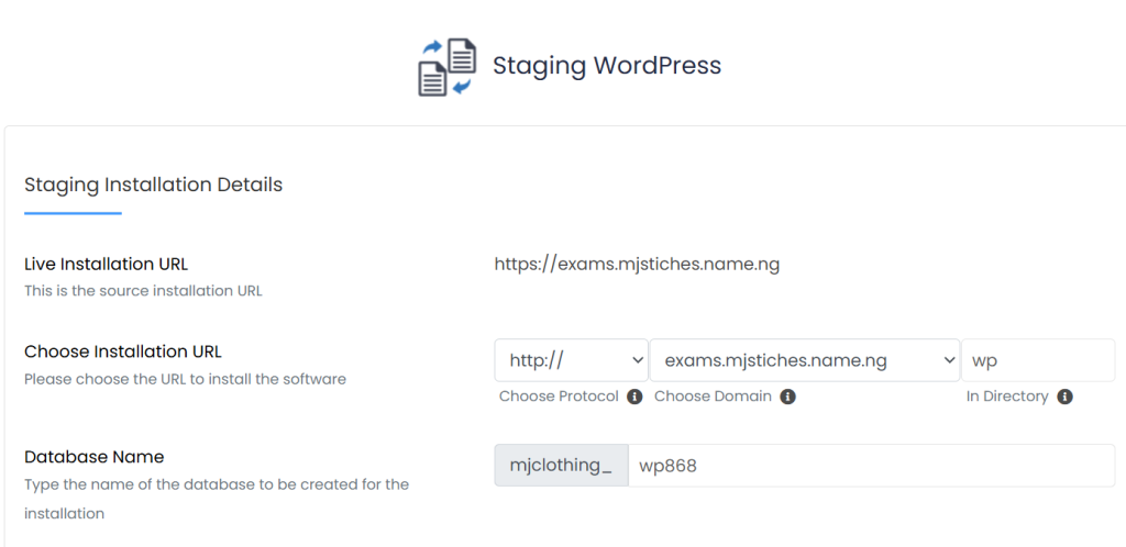 Directory Name: Example: staging (this will make your staging site accessible at yourdomain.com/staging).