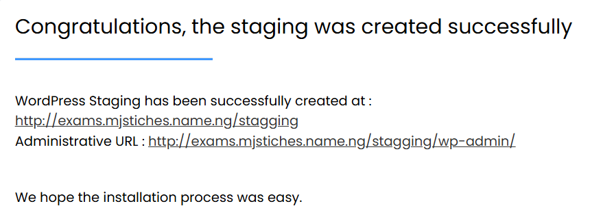 You will get a link to your staging site (e.g., yourdomain.com/staging).