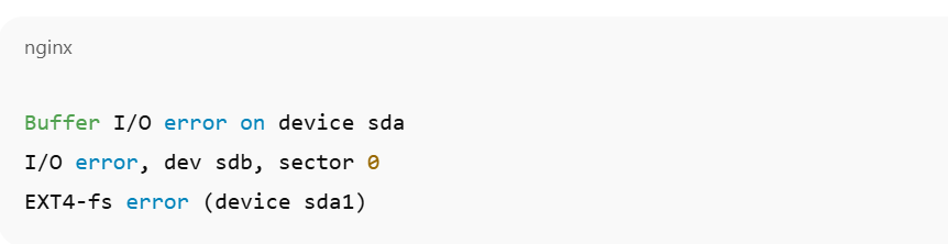 Disk I/O errors occur when the operating system fails to read from or write to a disk properly. The system logs may show messages like: